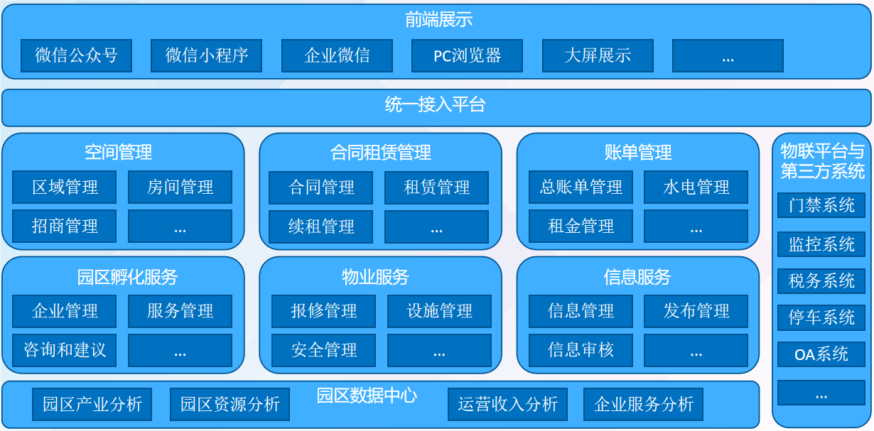 通过对科技创业园区的信息和运营进行数字化管理,做好园区空间信息管理、线上招商管理、合同和租赁管理、账单管理、物业服务、企业服务、信息服务,共“三管理三服务”的数字化支撑,实现了科技创业园区全流程数字化的运营管理,提升园区全流程数字化管理水平。